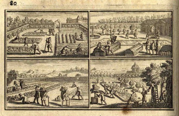 La botanique, c’est aussi des ouvrages pratiques et traités de jardinage. L’un des plus célèbre est l’Instruction pour les jardins fruitiers et potagers, avec un traité des Orangers, de Jean de La Quintinie (1624-1688). Les vignettes qui l’illustrent, outre la description des divers travaux d’entretien d’un jardin potager, permettent en plus de découvrir le Potager du Roi.